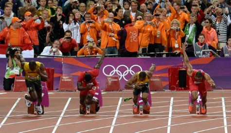 The bottle landed behind the sprinters (pictured top), coming to a halt a few feet behind Jamaican Yohan Blake, the eventual silver medallist, in lane five.